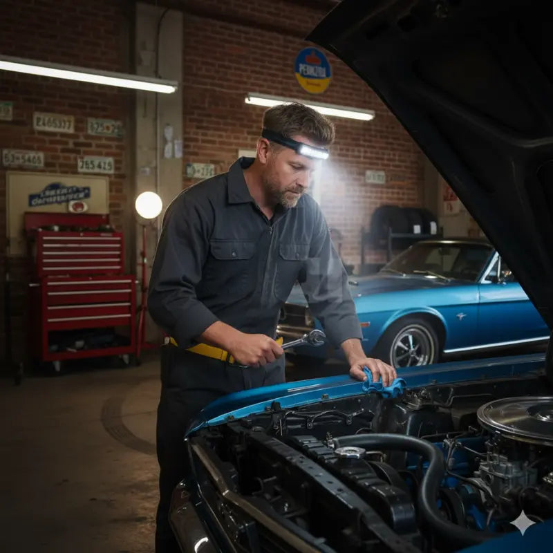 Breiter Strahl beleuchtet gesamten Motorraum. Wellensensor funktioniert durch Öl und Handschuhe. Leicht für stundenlange Arbeit.