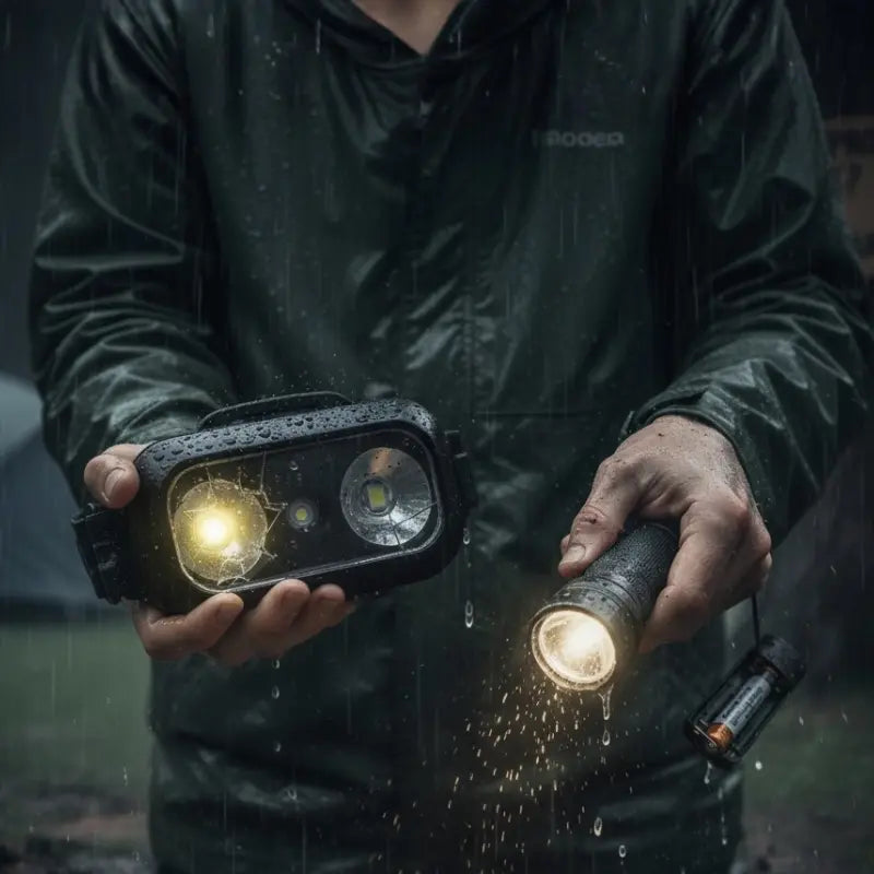 Ein bisschen Regen oder Feuchtigkeit und sie geben auf. Zurück zum Taschenlampen-Jonglieren bei Nässe.